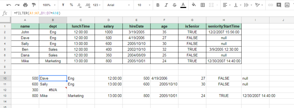 =FILTER(A1:H7,D1:D7=A10)